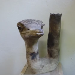 expositie van vogelkop van klei, (zaagselstook) “vogelkop met takkenbos”