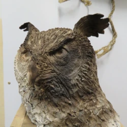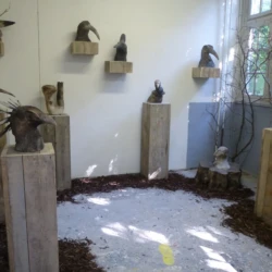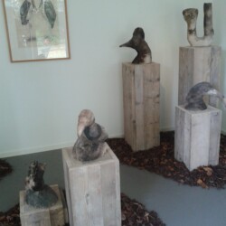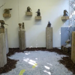 Expositie “Vogels in Beeld” met vogelkoppen van klei, (zaagselstook)